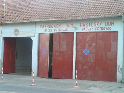 "Brandkåren i Bačsky Petrovec", skrivet på serbiska (ovanför den mellersta porten) och på slovakiska (ovanför den högra).